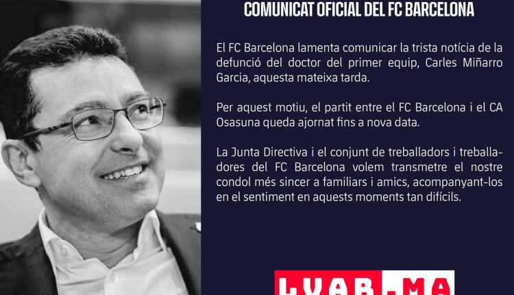 وجاء في البيان : “يأسف نادي برشلونة للإعلان عن النبأ الحزين بوفاة طبيب الفريق الأول، كارليس مينيارو جارسيا، بعد ظهر اليوم.. ولهذا السبب، تم تأجيل مباراة برشلونة وأوساسونا إلى موعد جديد.. يرغب مجلس الإدارة وجميع العاملين في نادي برشلونة في تقديم خالص تعازينا للعائلة والأصدقاء، ومرافقتهم في مشاعرهم في هذه الأوقات الصعبة.”