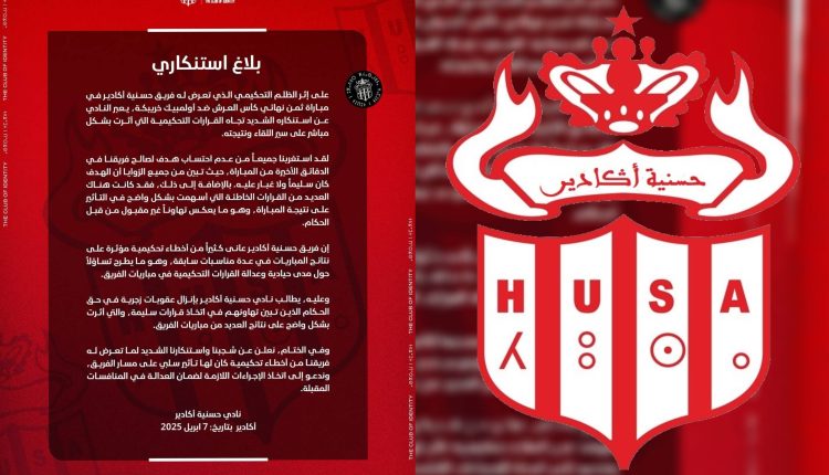 حسنية أكادير تندد بالتحكيم وتطالب بإنصاف فريقها : احتجاج رسمي يُعيد النقاش حول نزاهة المنافسات (بلاغ)